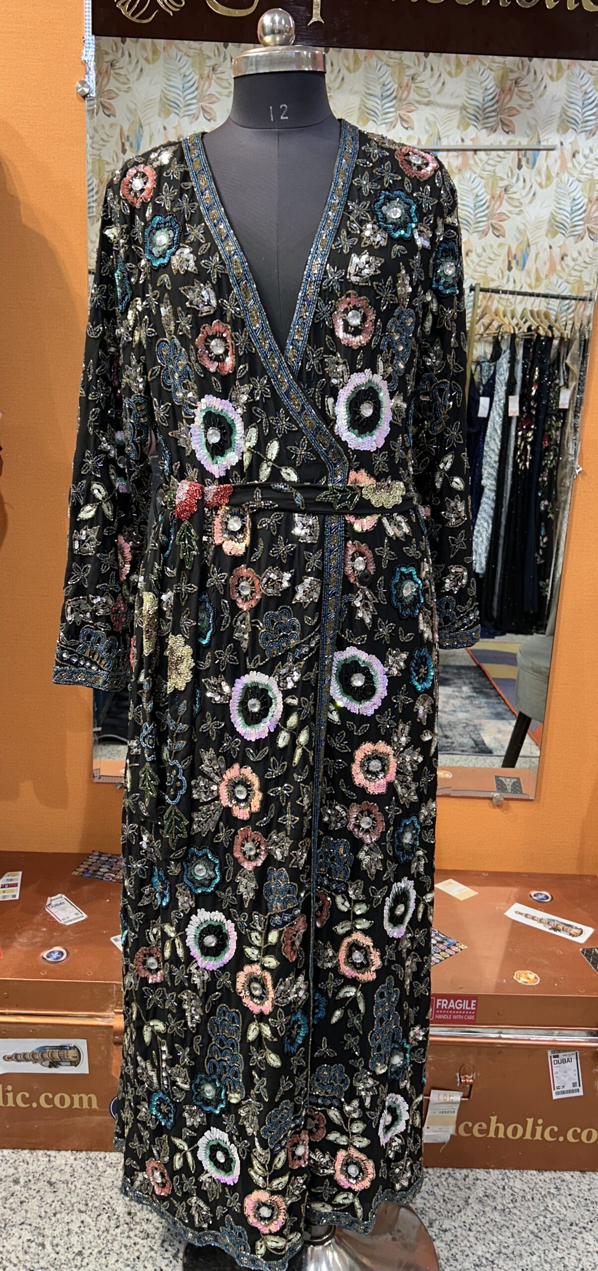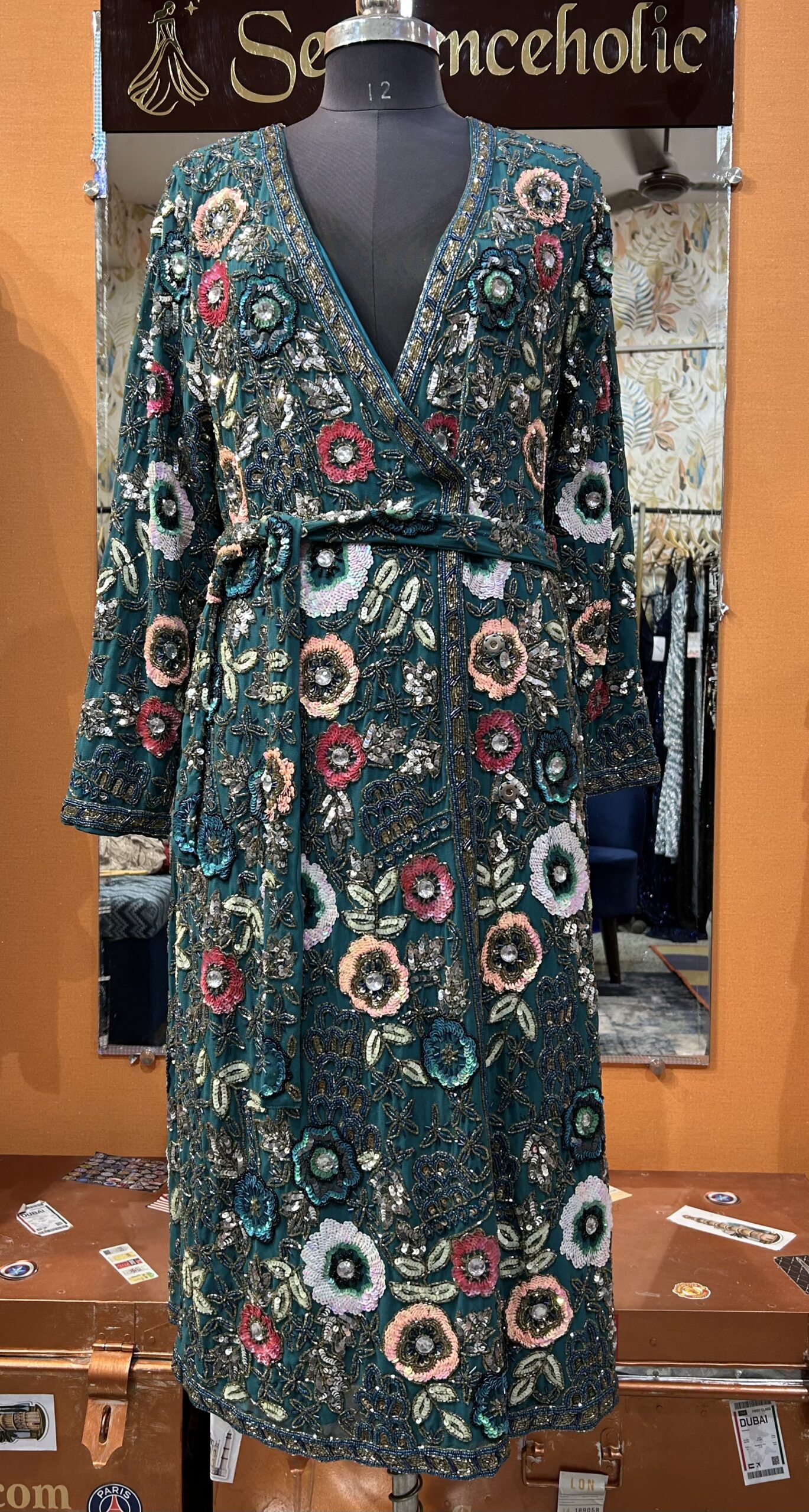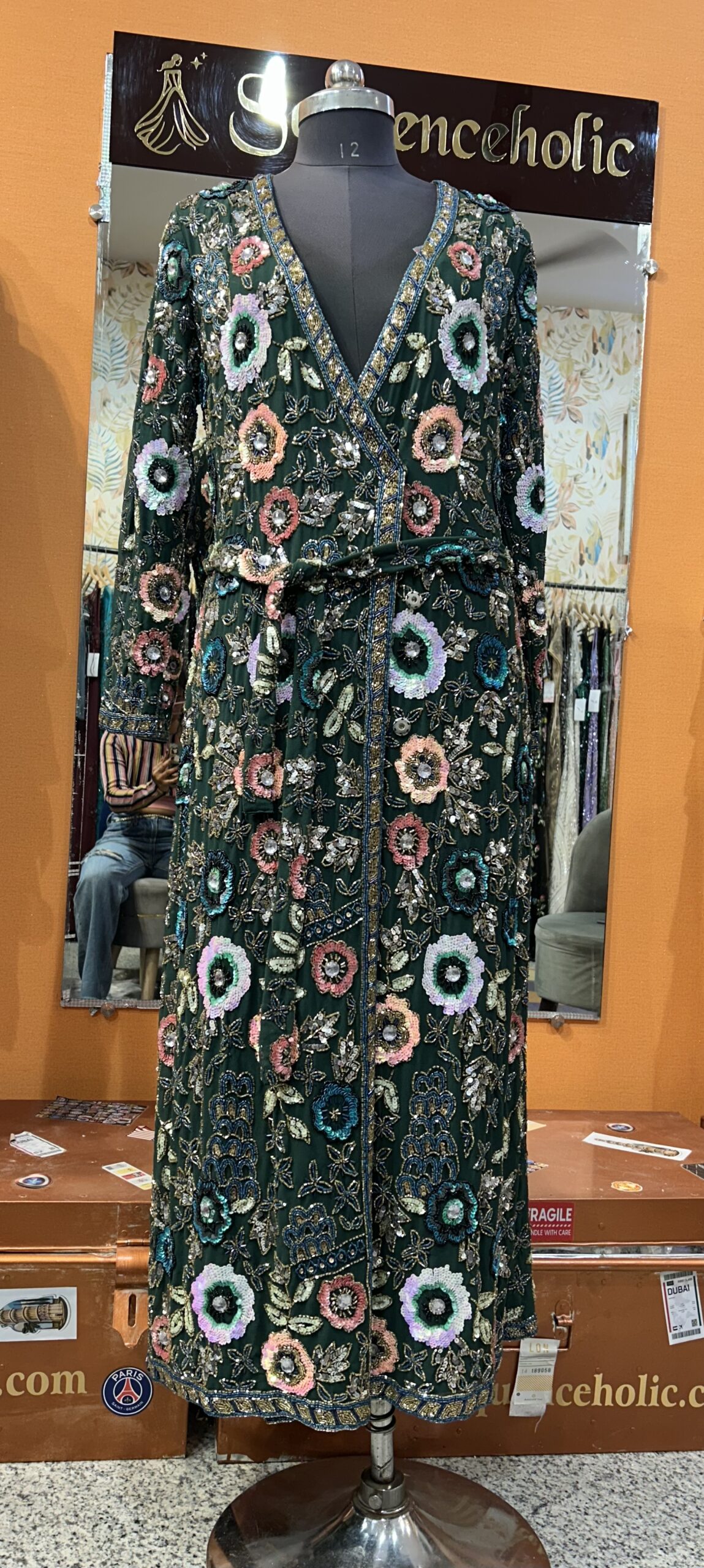 The image displays a long, dark green garment, likely a coat or dress, richly embellished with intricate floral embroidery and sequin work.