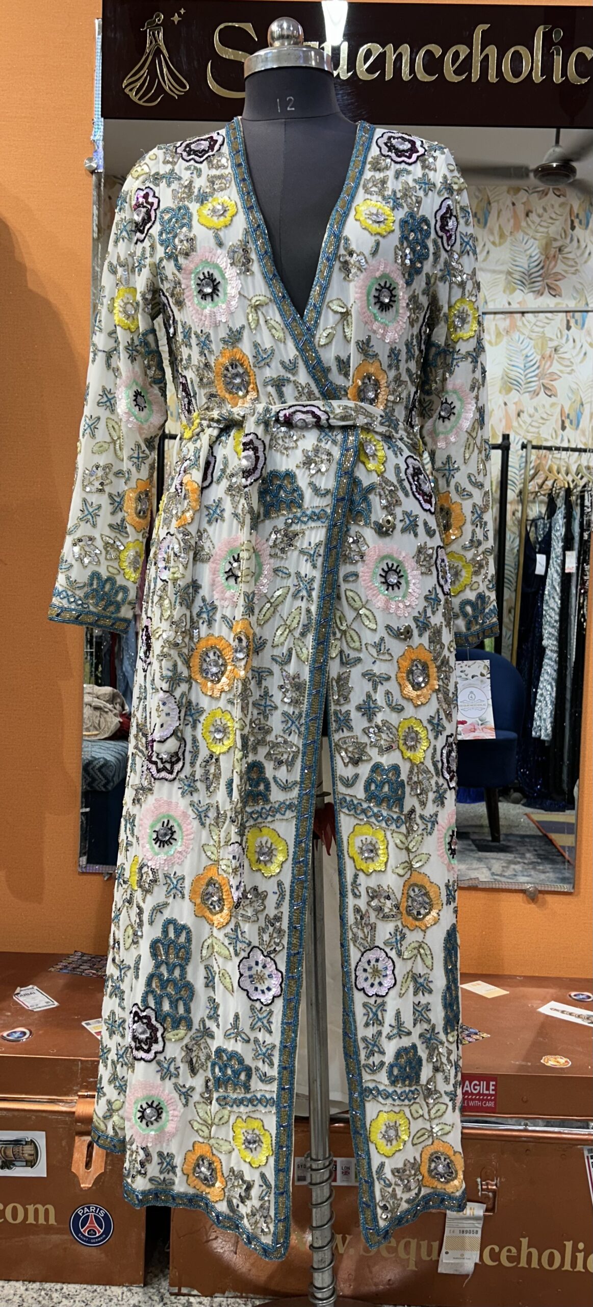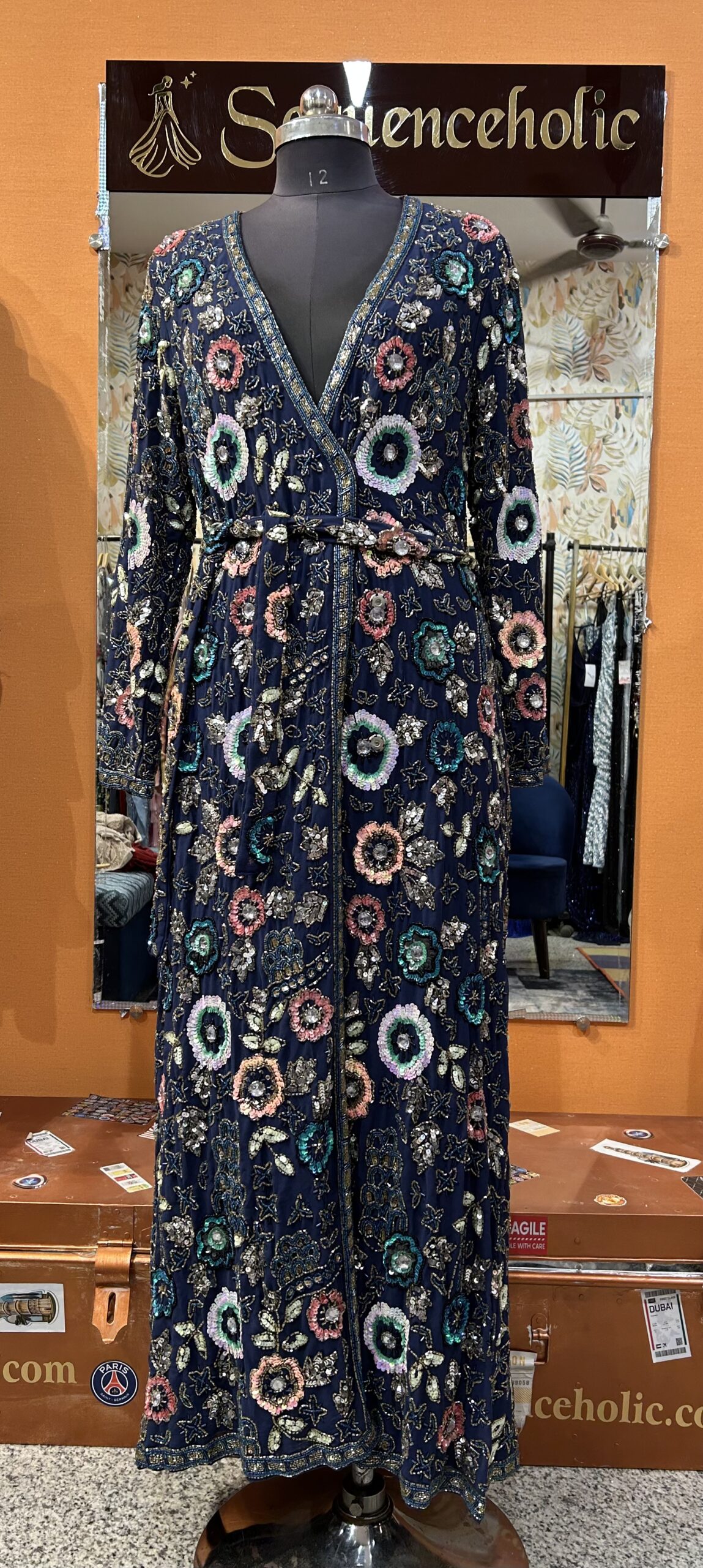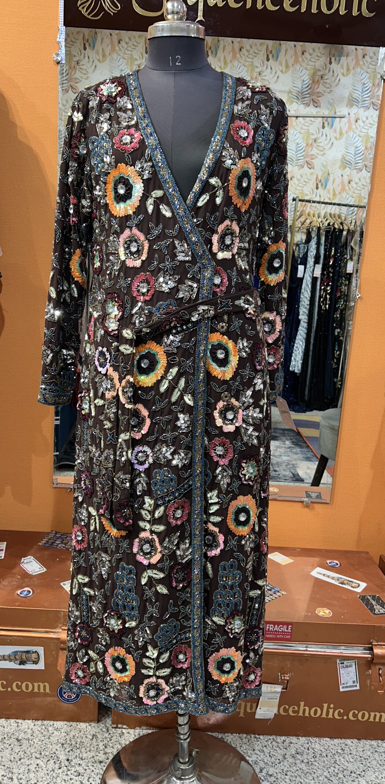 The image displays a long, dark green garment, likely a coat or dress, richly embellished with intricate floral embroidery and sequin work.