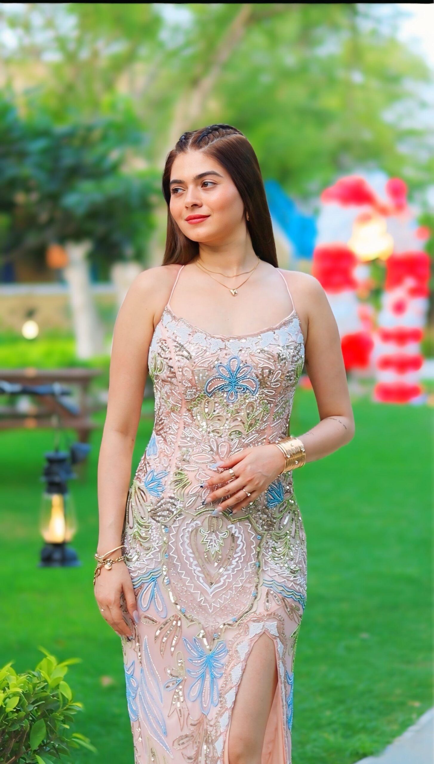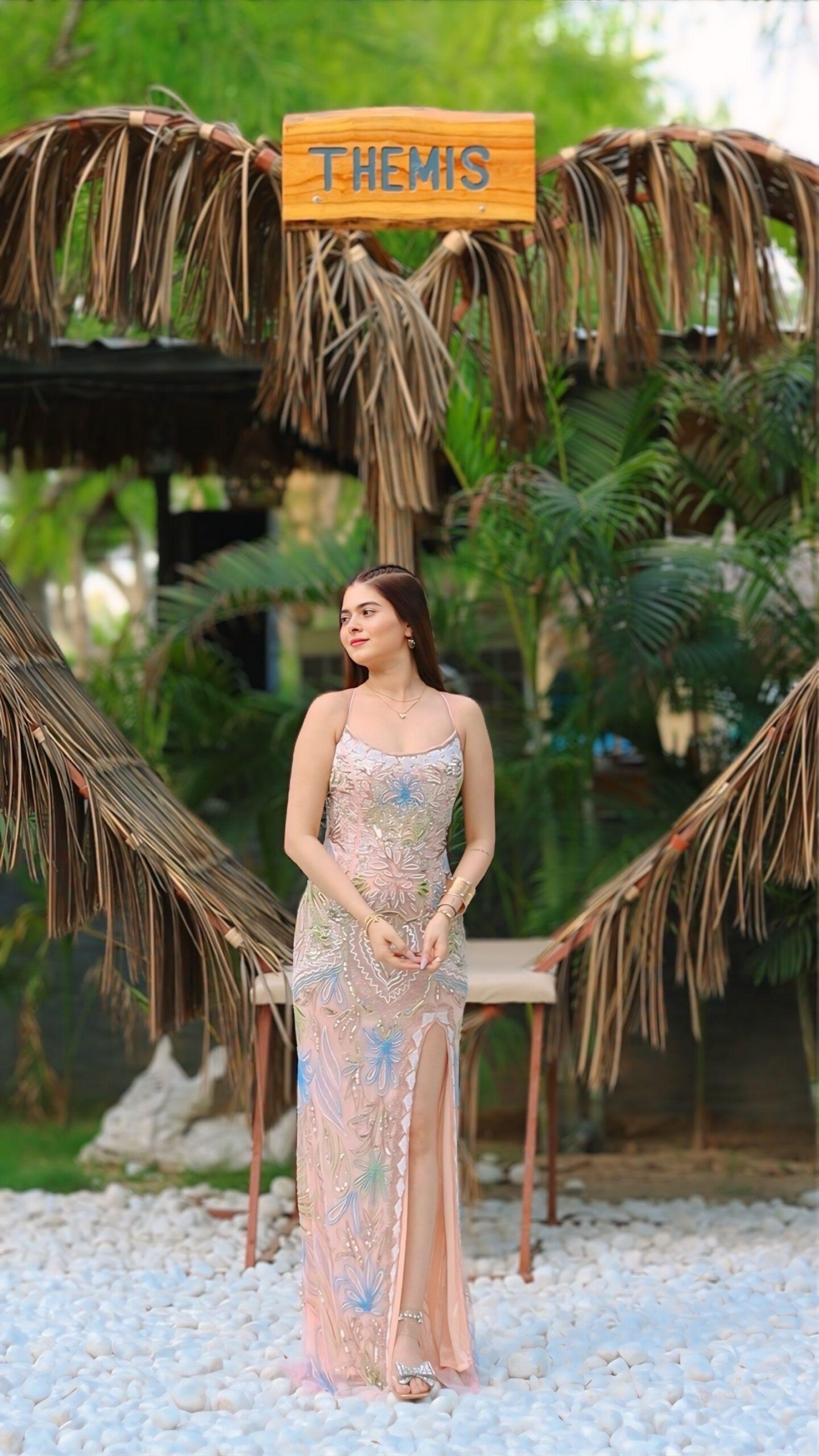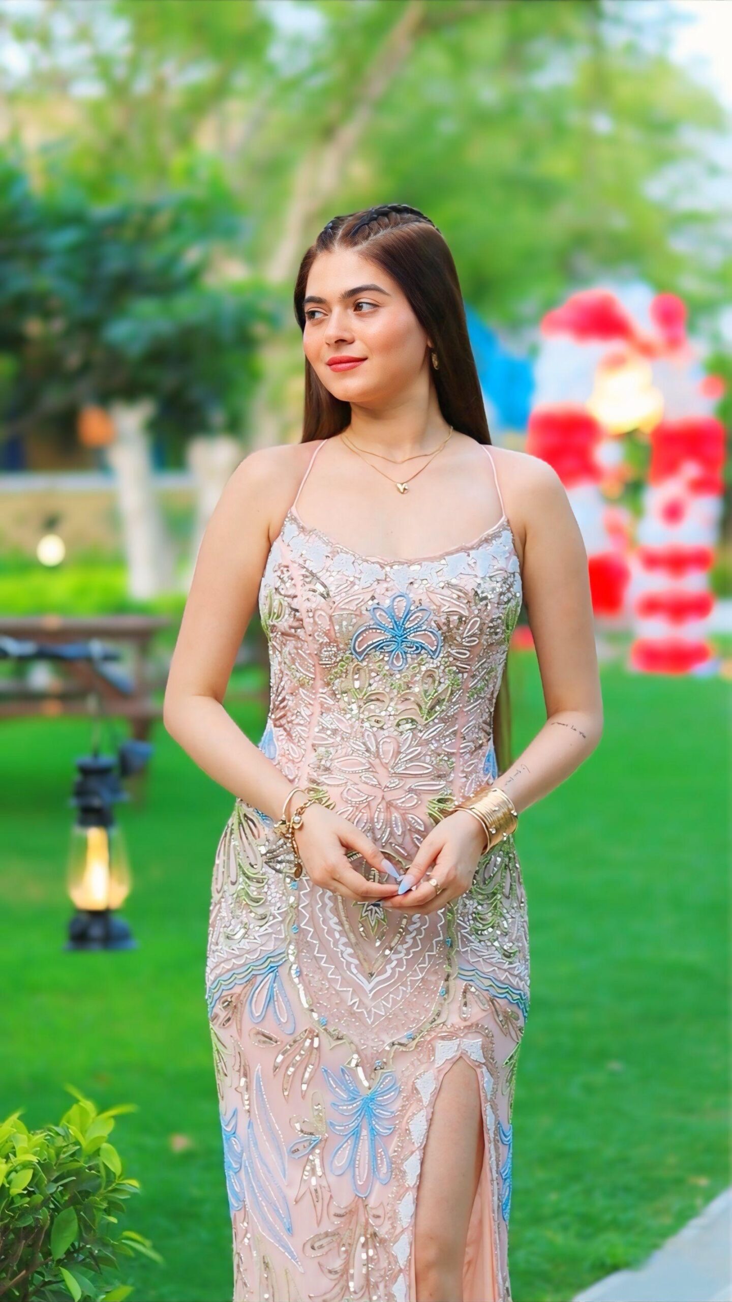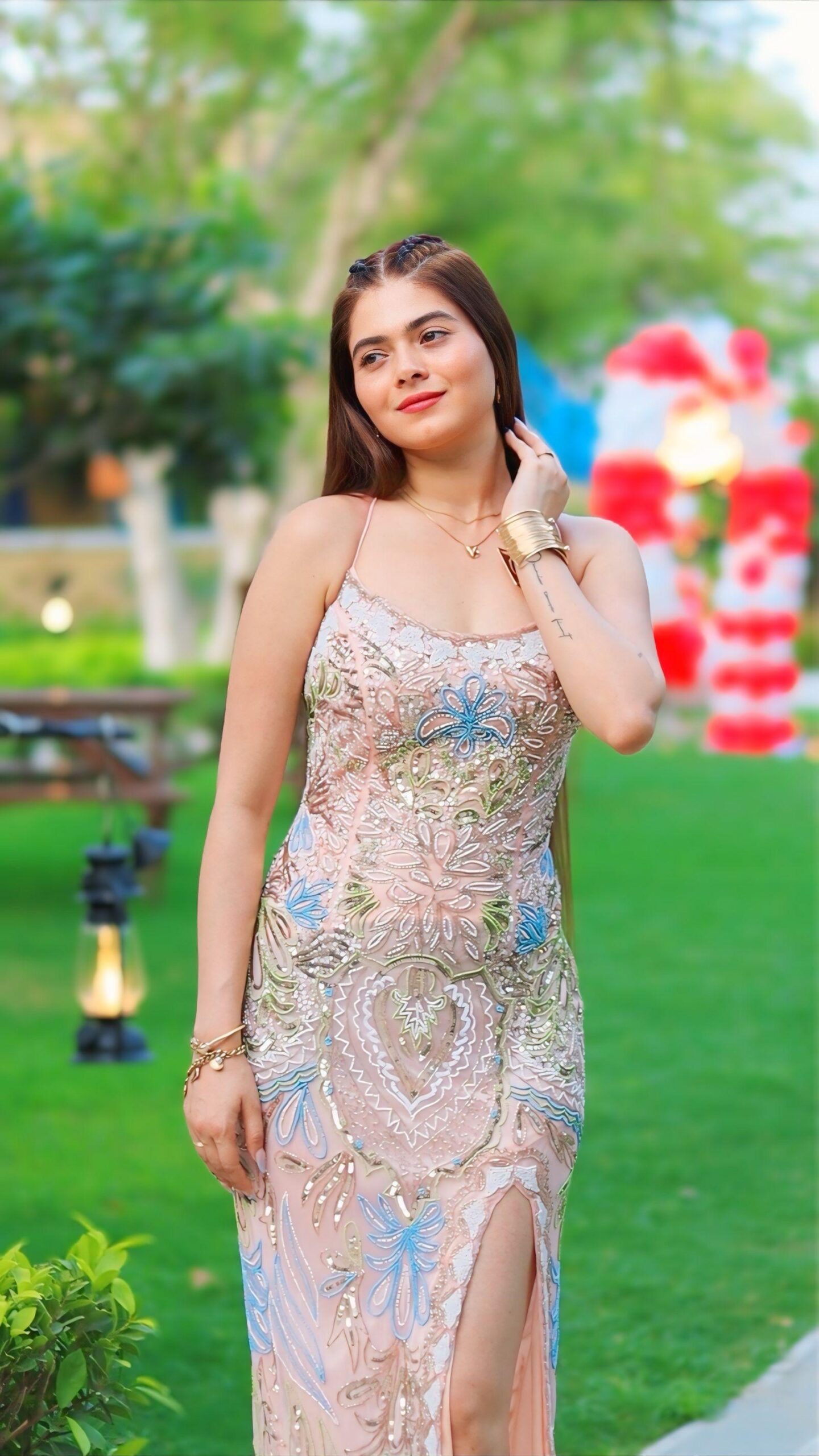 This dress is a long, fitted gown with intricate beadwork and a scoop strapless neckline. It is designed for special occasions such as prom, homecoming, or other formal events.